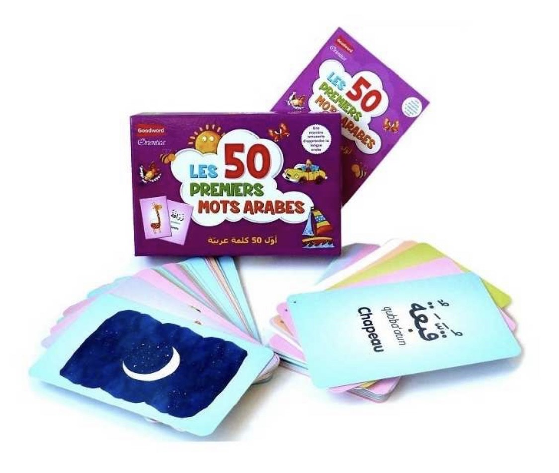 Les 50 Premiers Mots Arabes »  est un jeu éducatif conçu pour introduire les enfants à partir de 3 ans à la langue arabe de manière ludique et interactive. Ce jeu comprend 50 grandes cartes cartonnées, chacune mesurant 17 x 11 cm, présentant un mot arabe différent. Avec 10 façons différentes de jouer, ce jeu est parfait pour encourager l’apprentissage du vocabulaire arabe de base tout en s’amusant. Les cartes sont spécialement conçues pour les jeunes apprenants, avec des images colorées pour faciliter la mémorisation des mots.