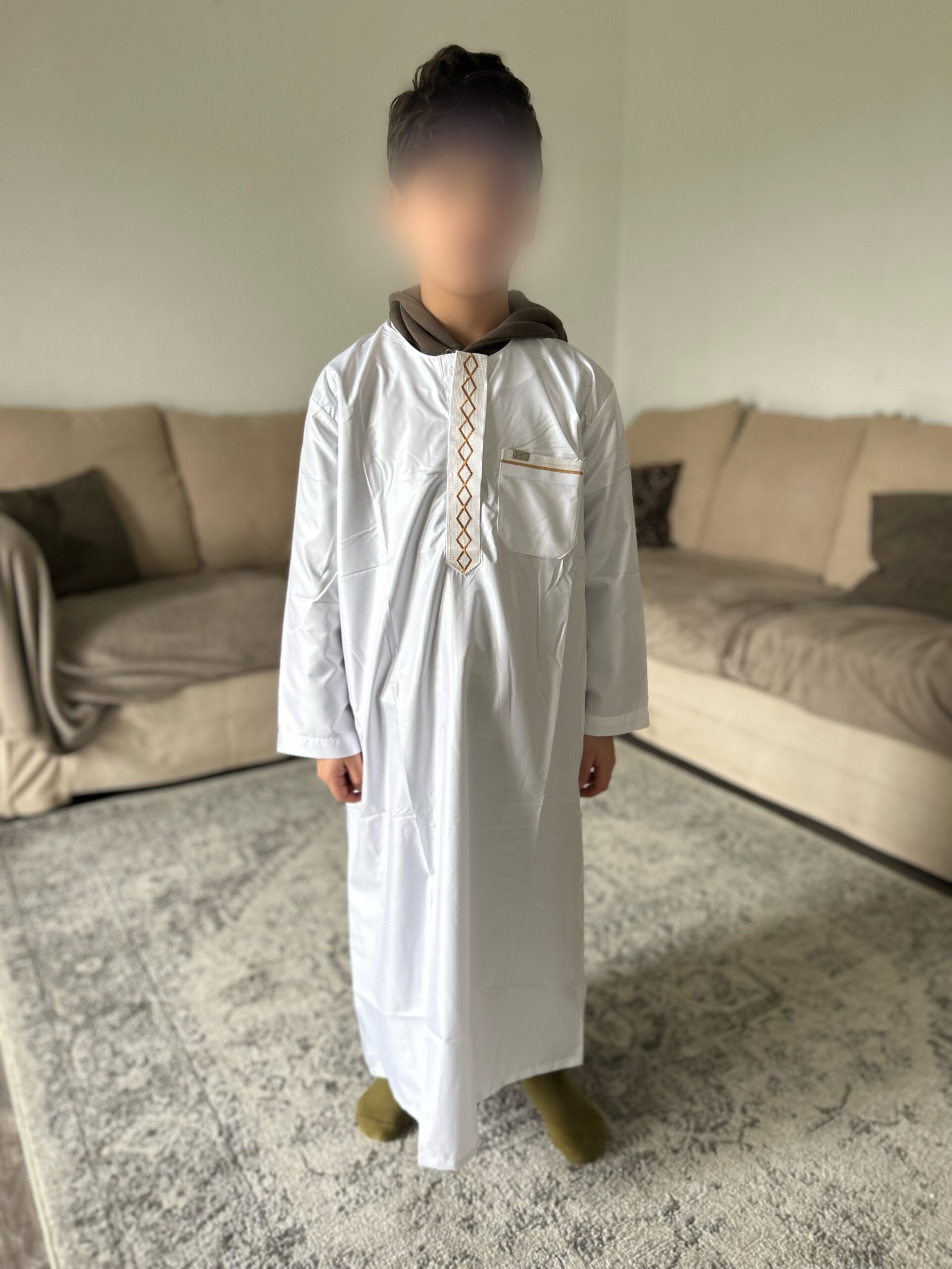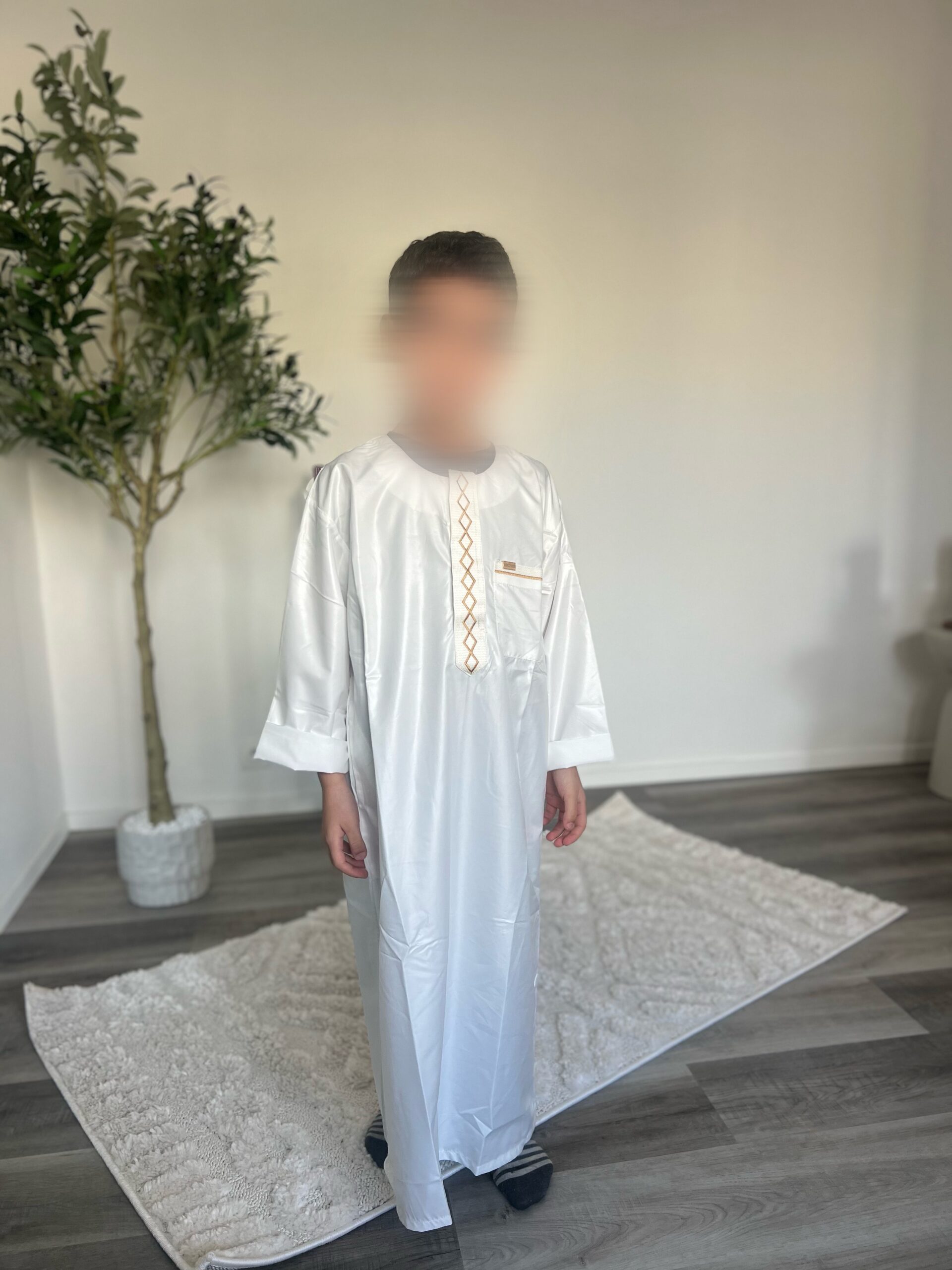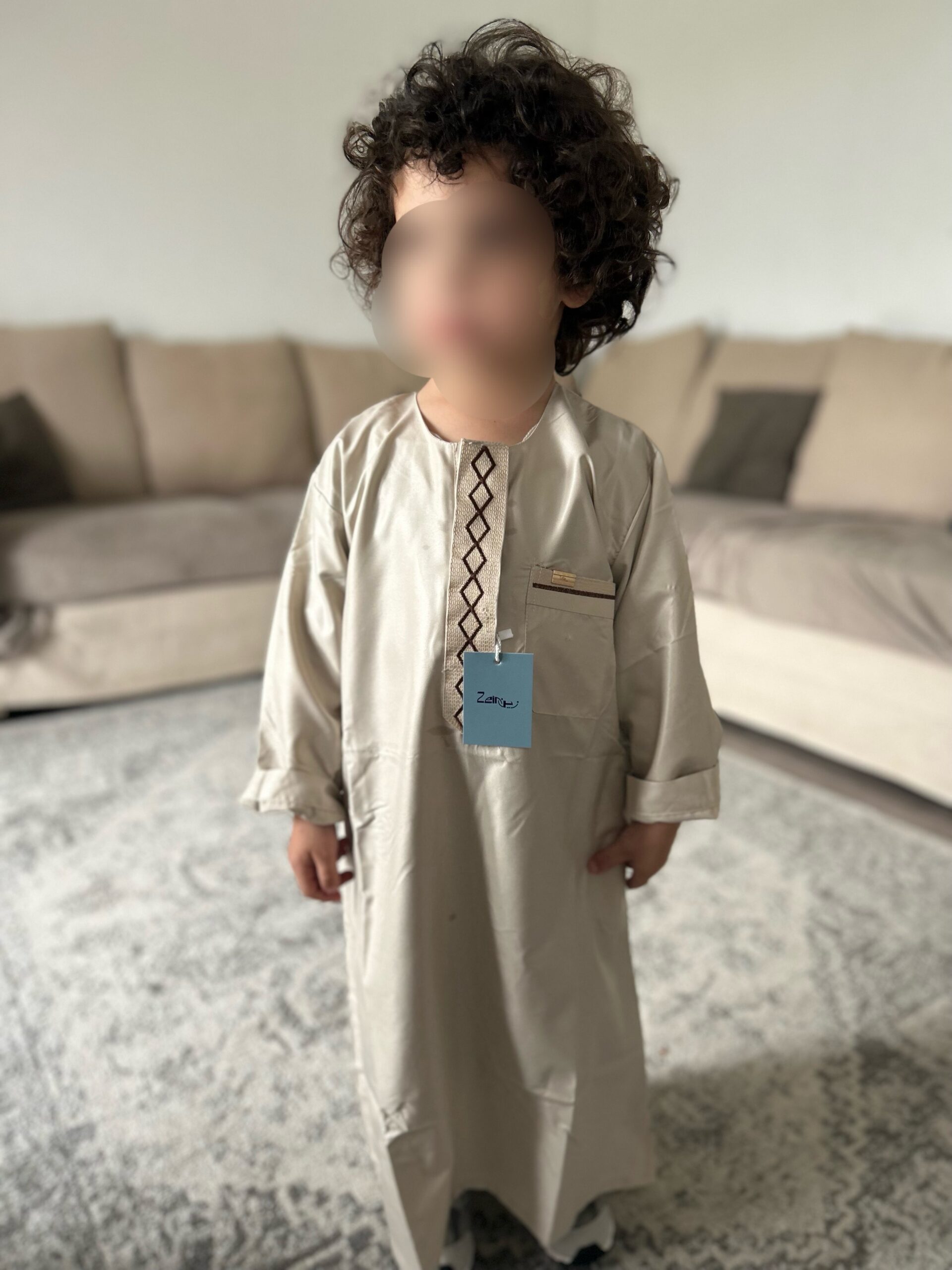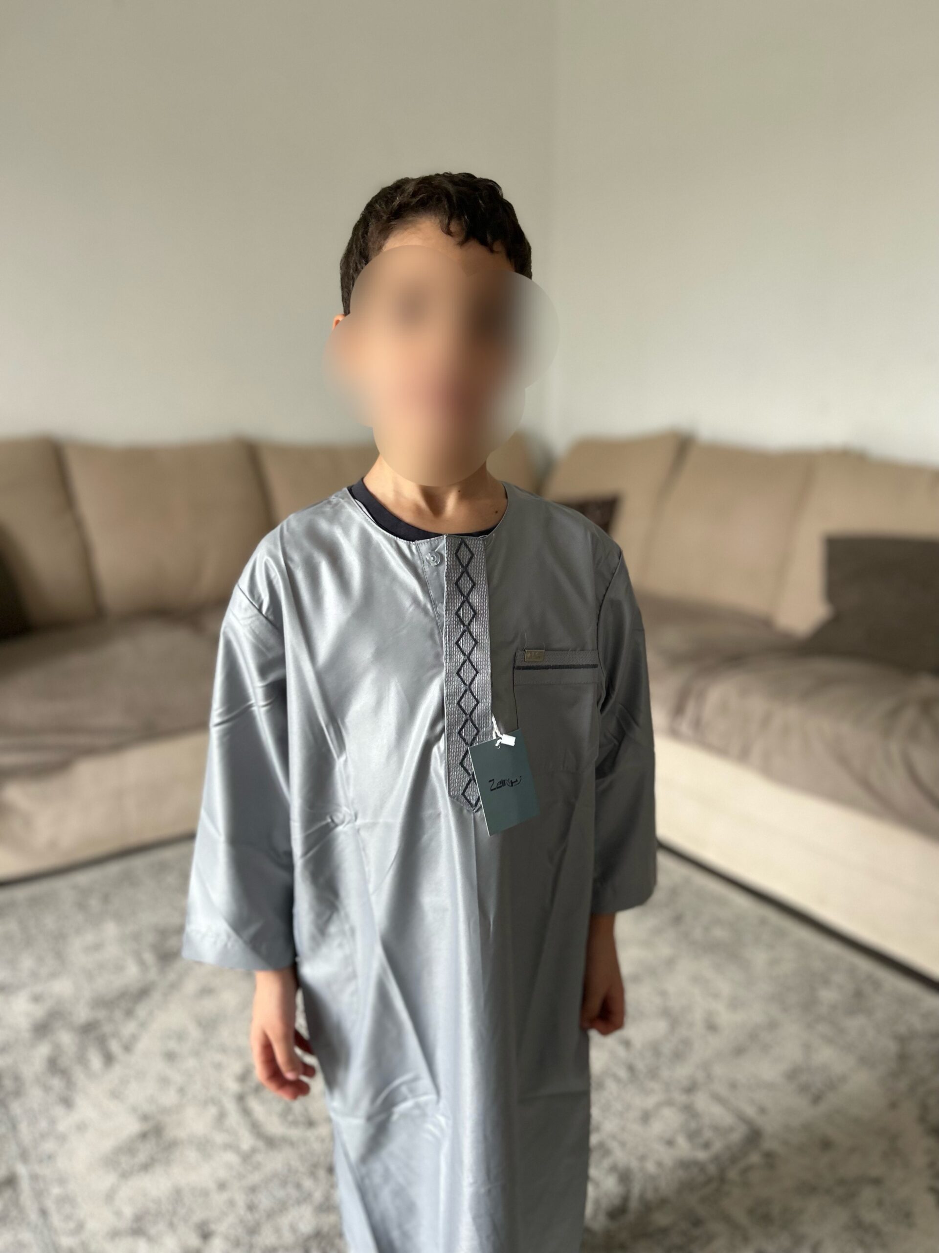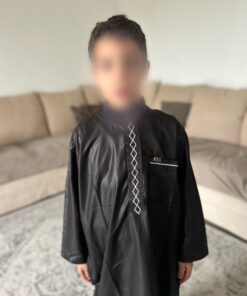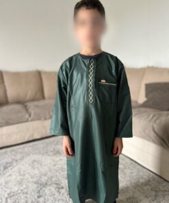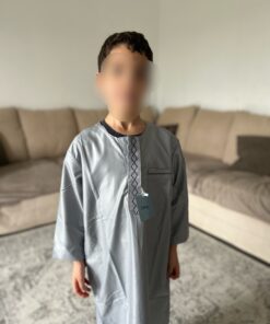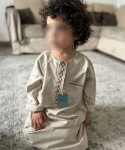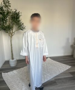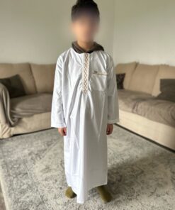 Qamis enfant de la marque Zein, confectionné avec soin et orné de jolis motifs brodés sur le devant.