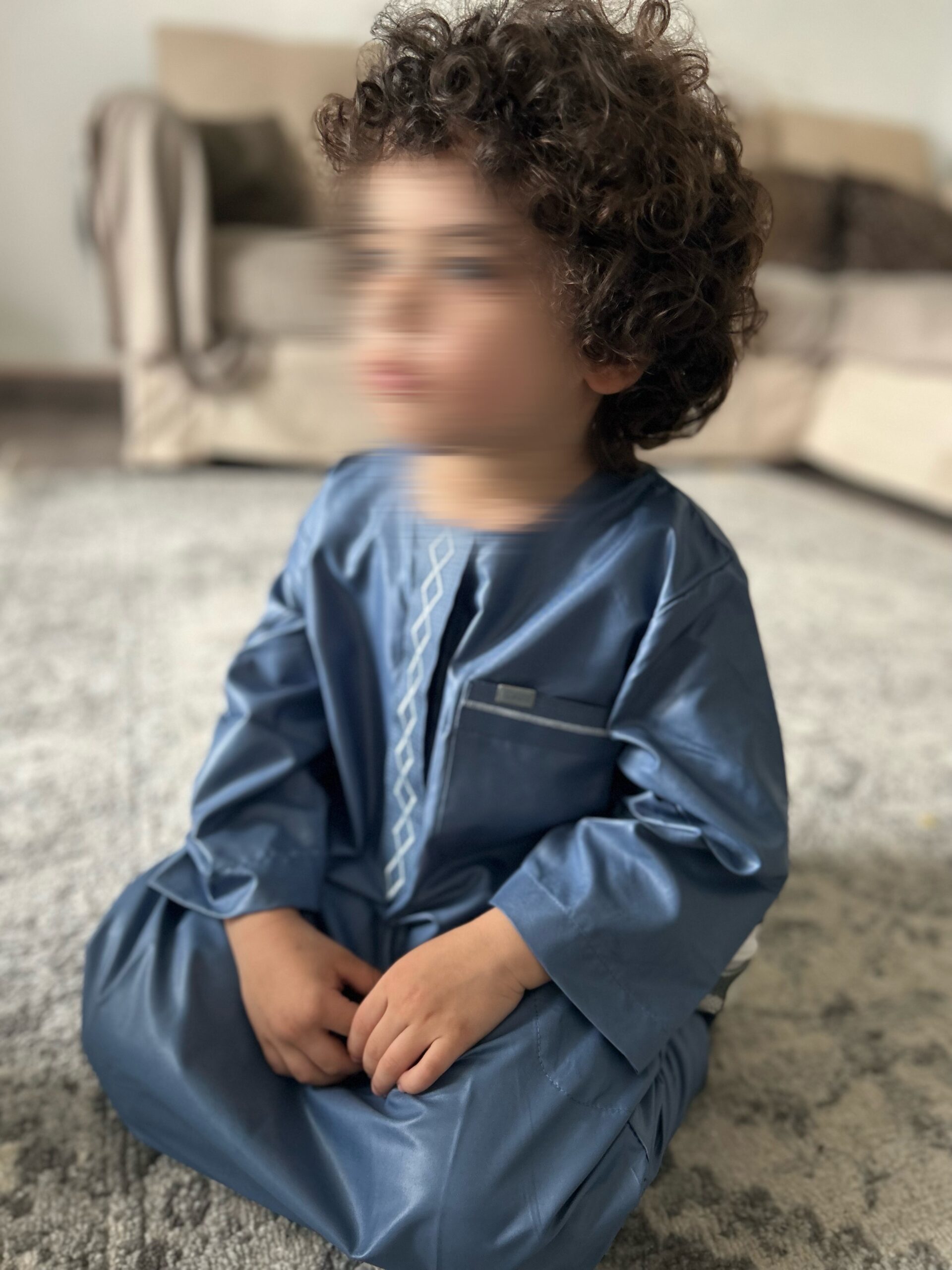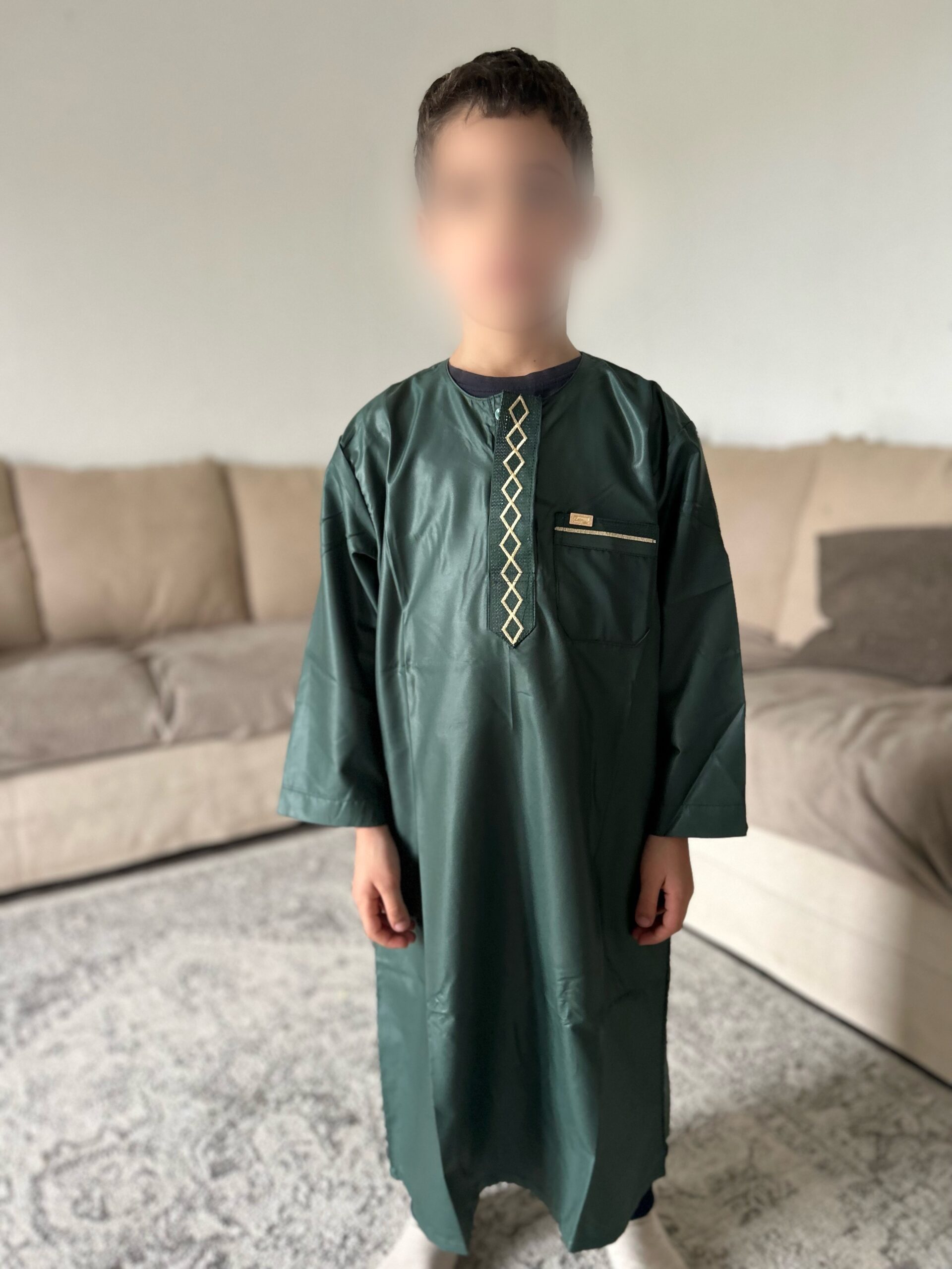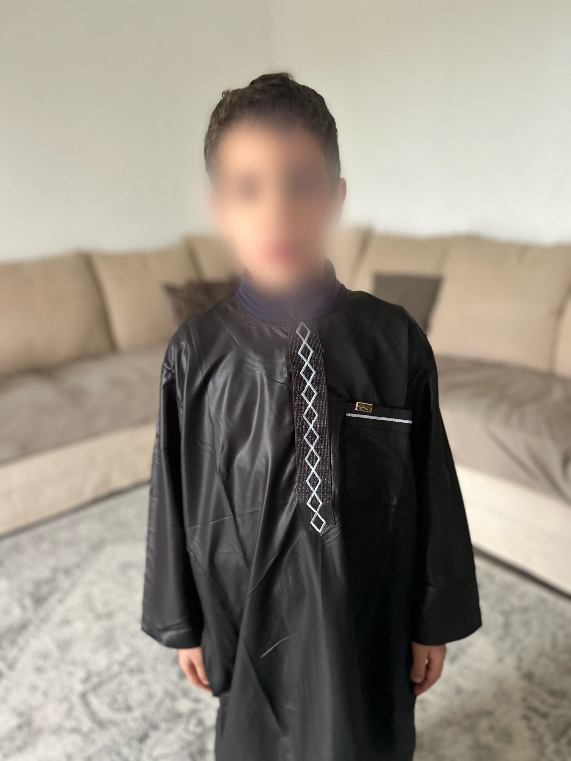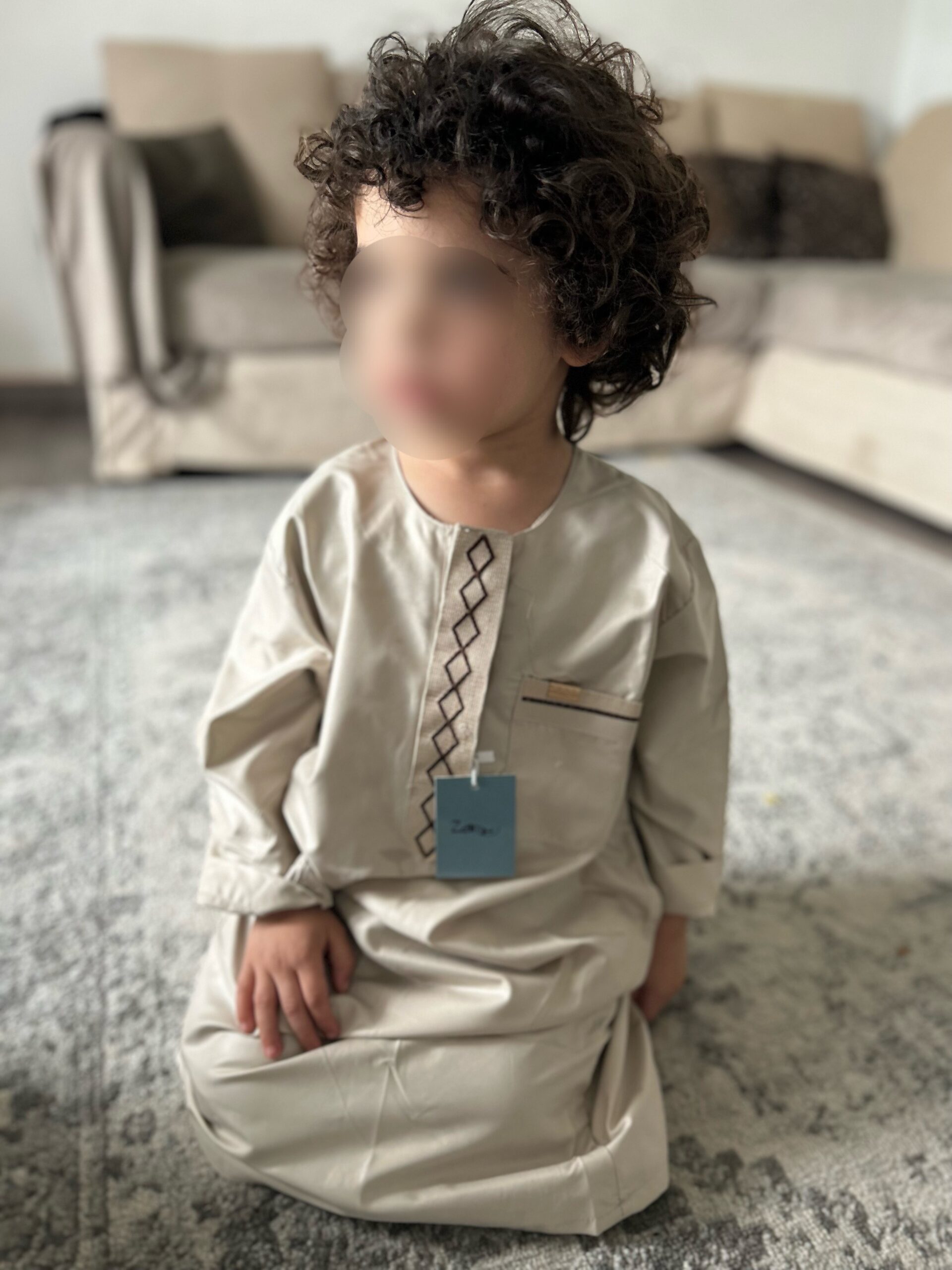 Qamis enfant de la marque Zein, confectionné avec soin et orné de jolis motifs brodés sur le devant.